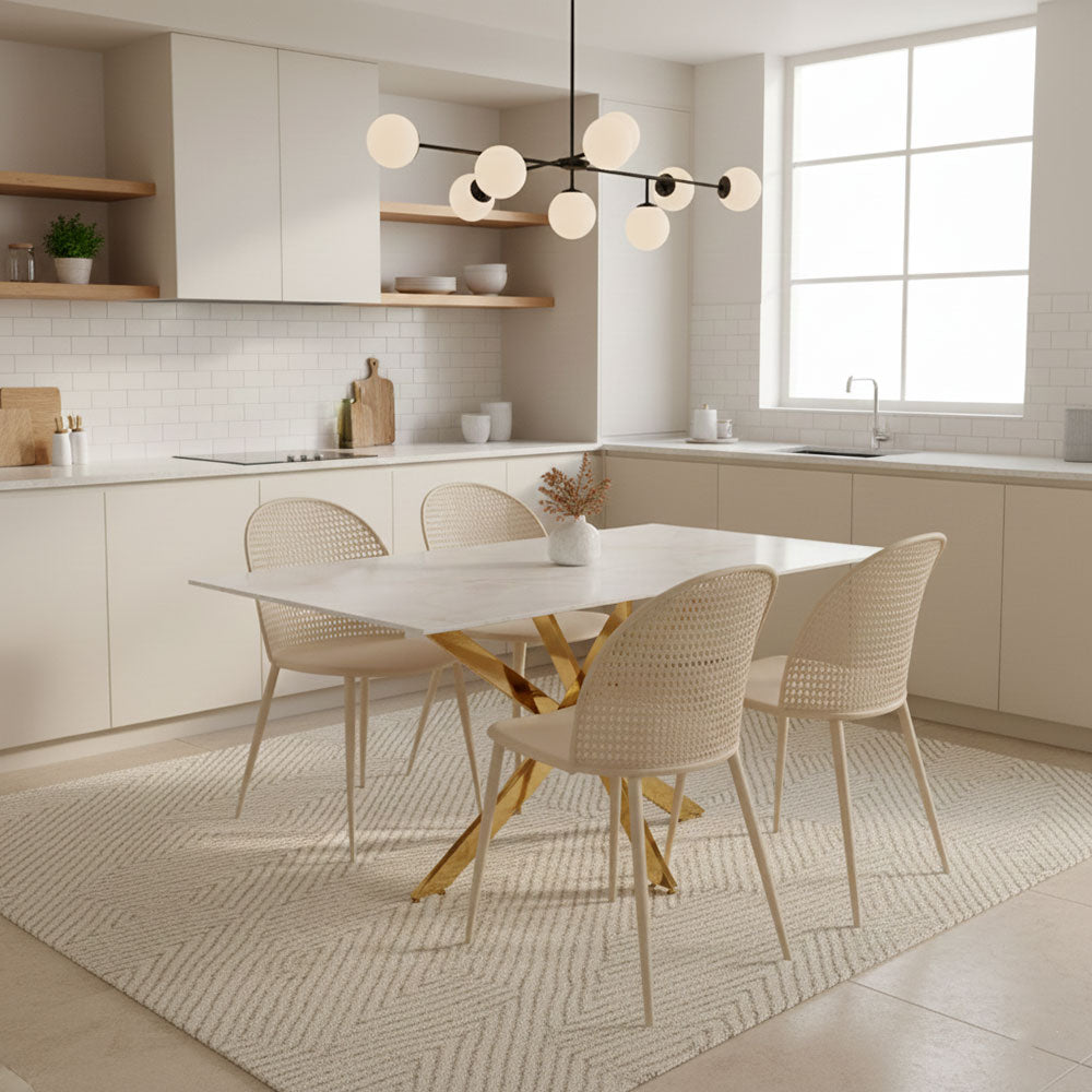 Le dossier, avec son délicat effet tressé, ajoute non seulement une touche de raffinement, mais garantit également confort et soutien lors de l’utilisation. Ces chaises sont idéales pour les espaces intérieurs, mais grâce à leur solidité, elles conviennent également aux zones extérieures protégées des intempéries, comme les terrasses et les vérandas.