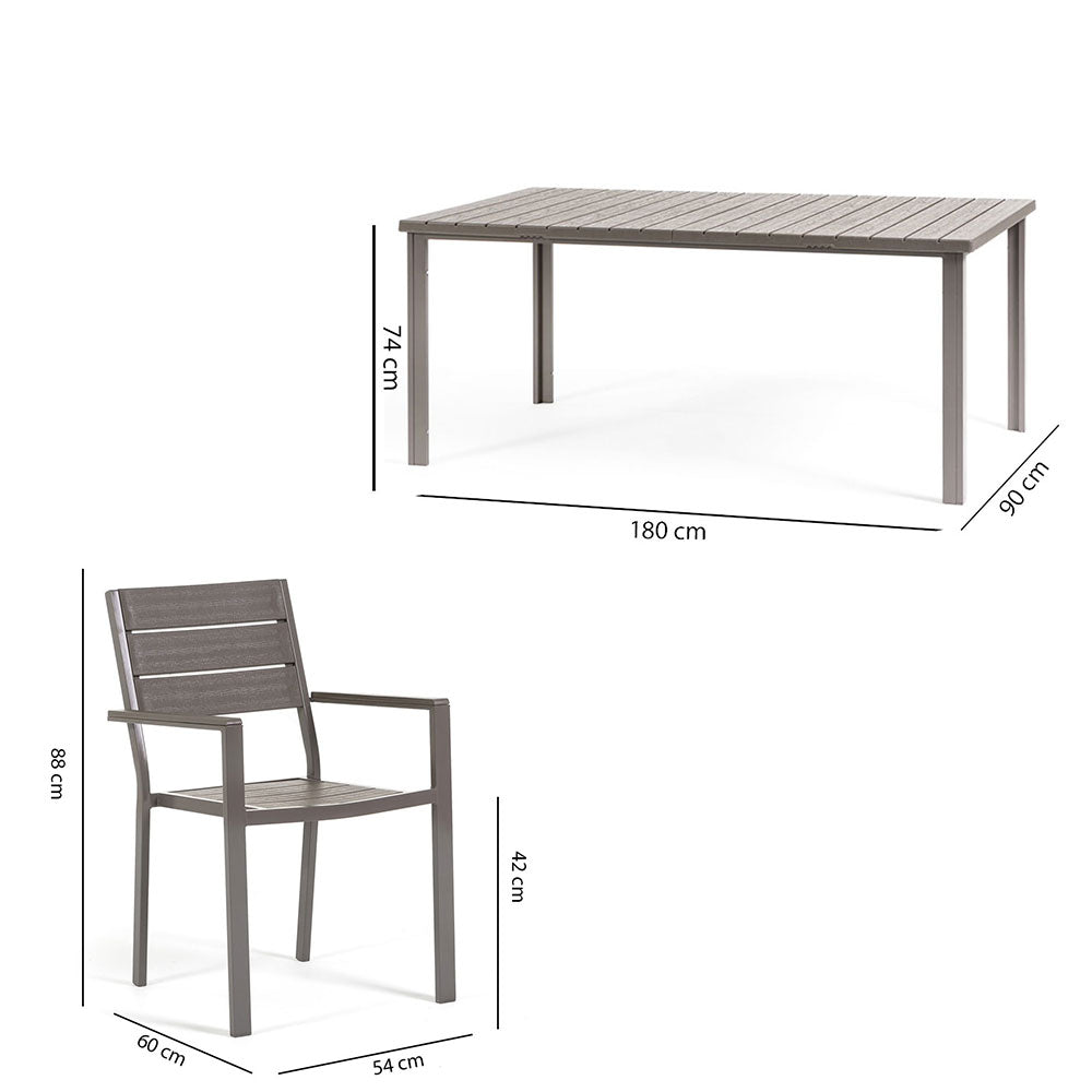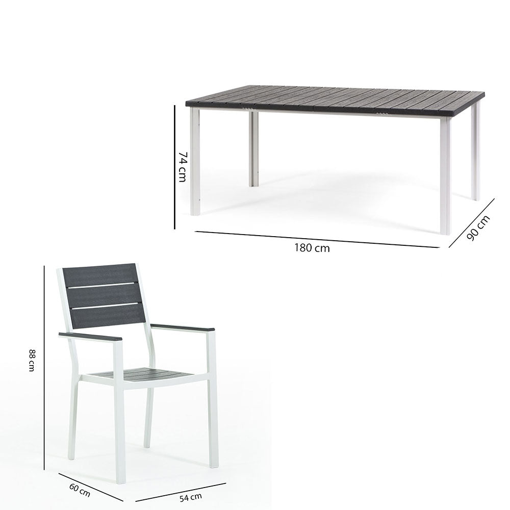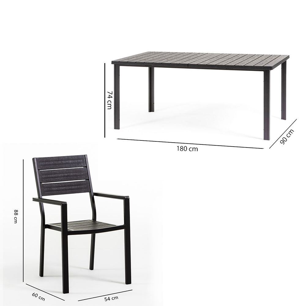 Dimensions: table: 180Lx90Px75Hcm / fauteuil: 54Lx60Px88H cm