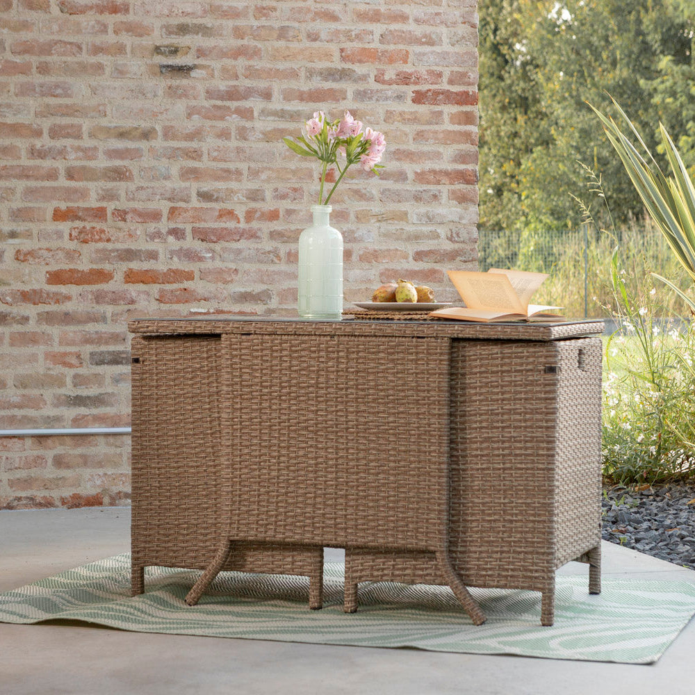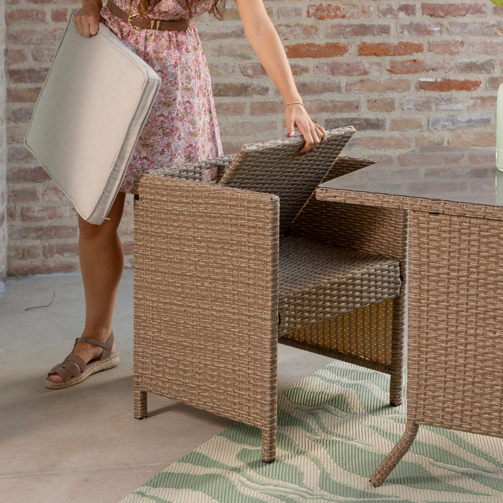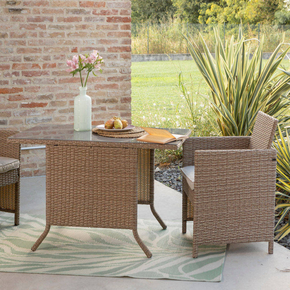 Le plateau de la table, en verre trempé de 5 mm, repose sur une structure en fer recouverte d’un tressage en résine (polyrattan), pour un ensemble solide, résistant et durable dans le temps.