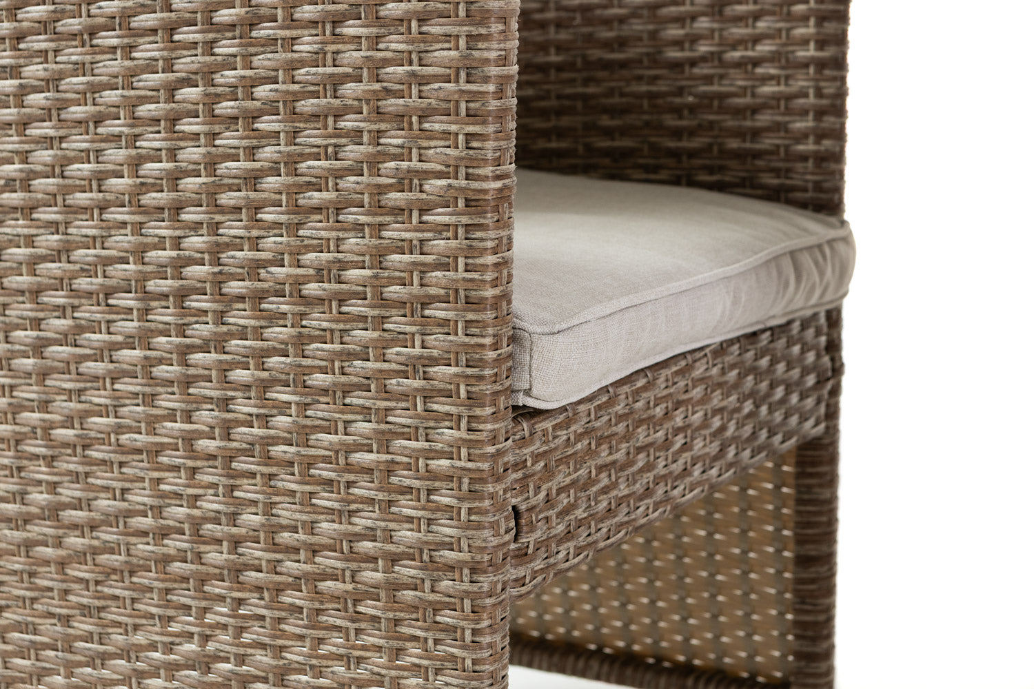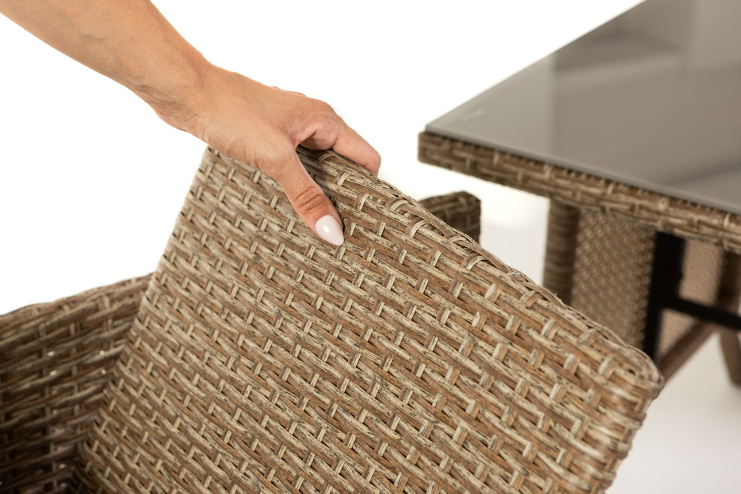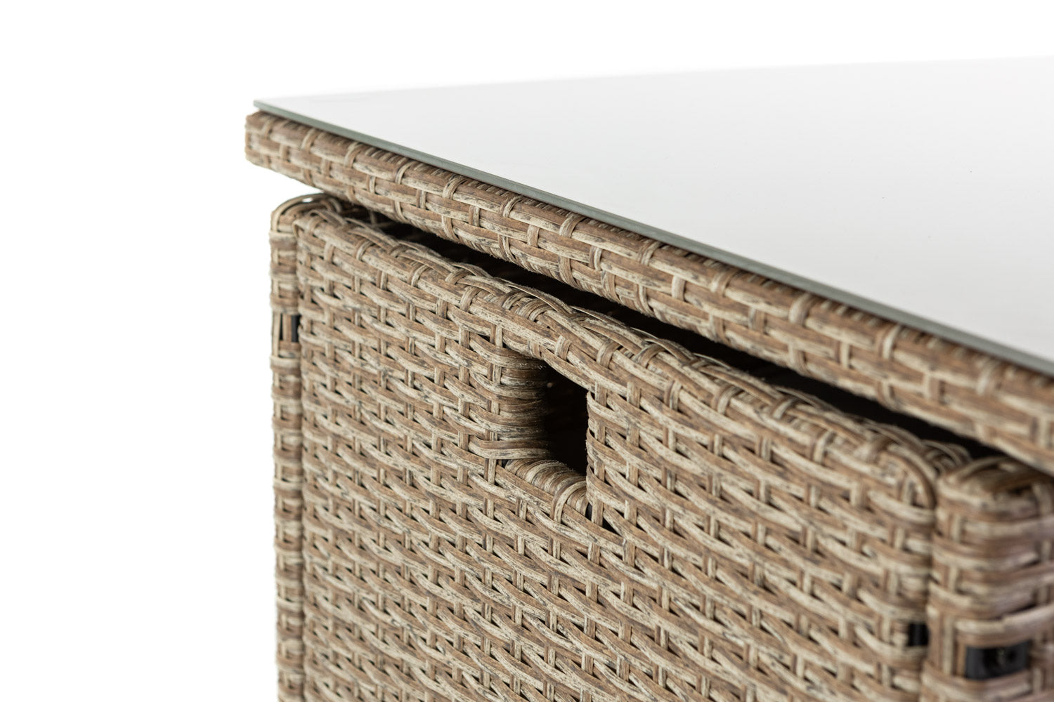 Le plateau de la table, en verre trempé de 5 mm, repose sur une structure en fer recouverte d’un tressage en résine (polyrattan), pour un ensemble solide, résistant et durable dans le temps.