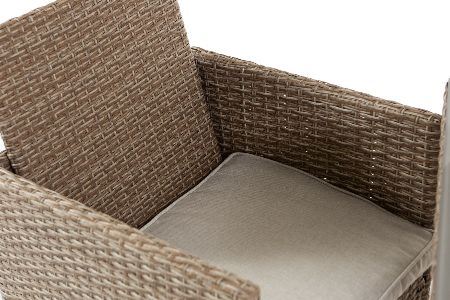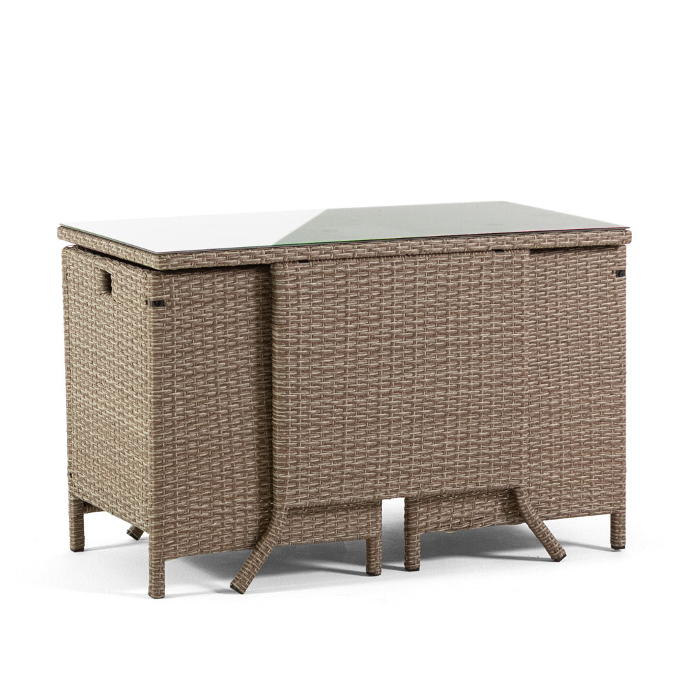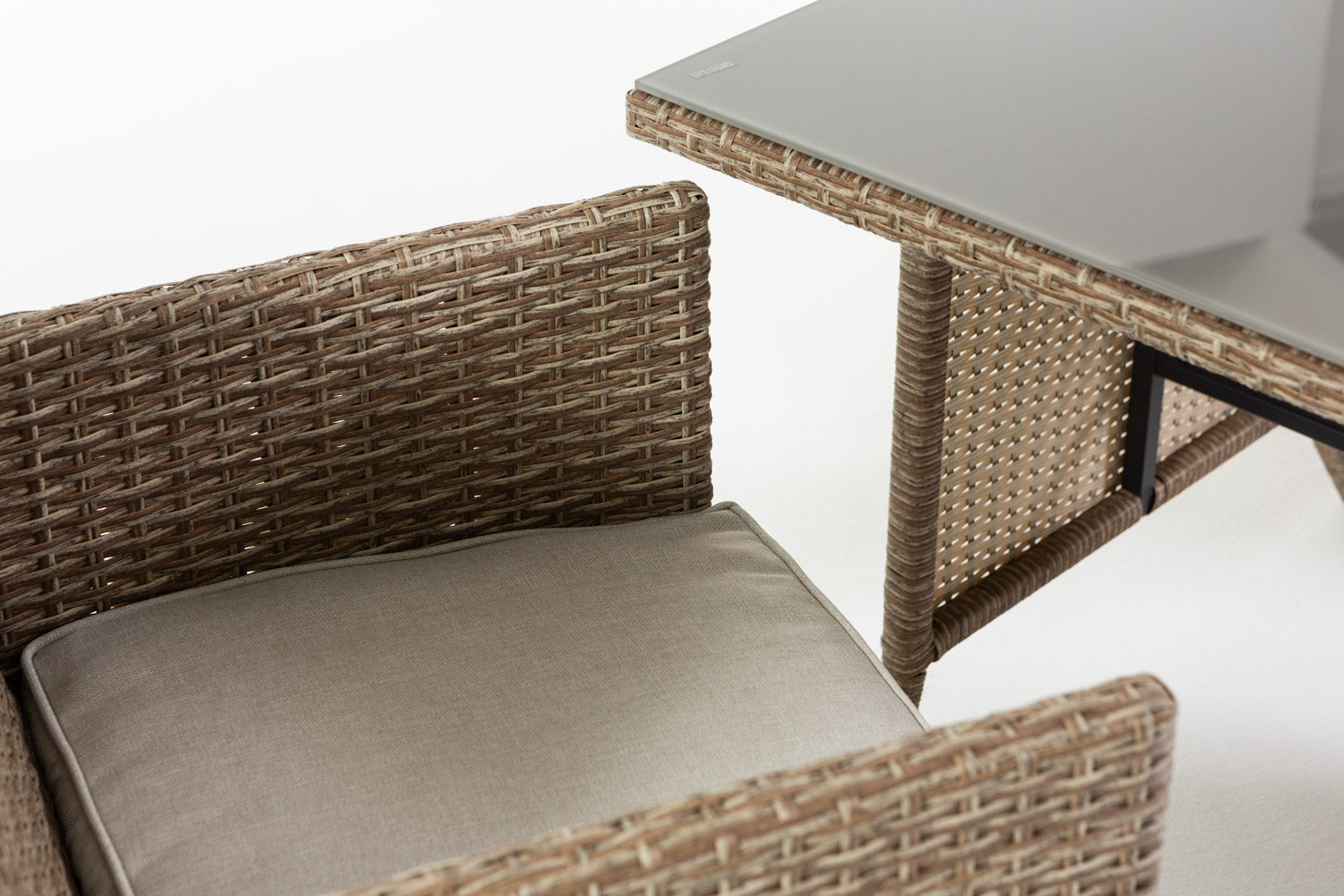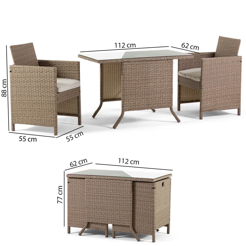 Ensemble GARDA XL comprend une table de 112x62 cm et deux fauteuils escamotables avec coussins qui peuvent être facilement placés sous la table, offrant ainsi une solution gain de place idéale.