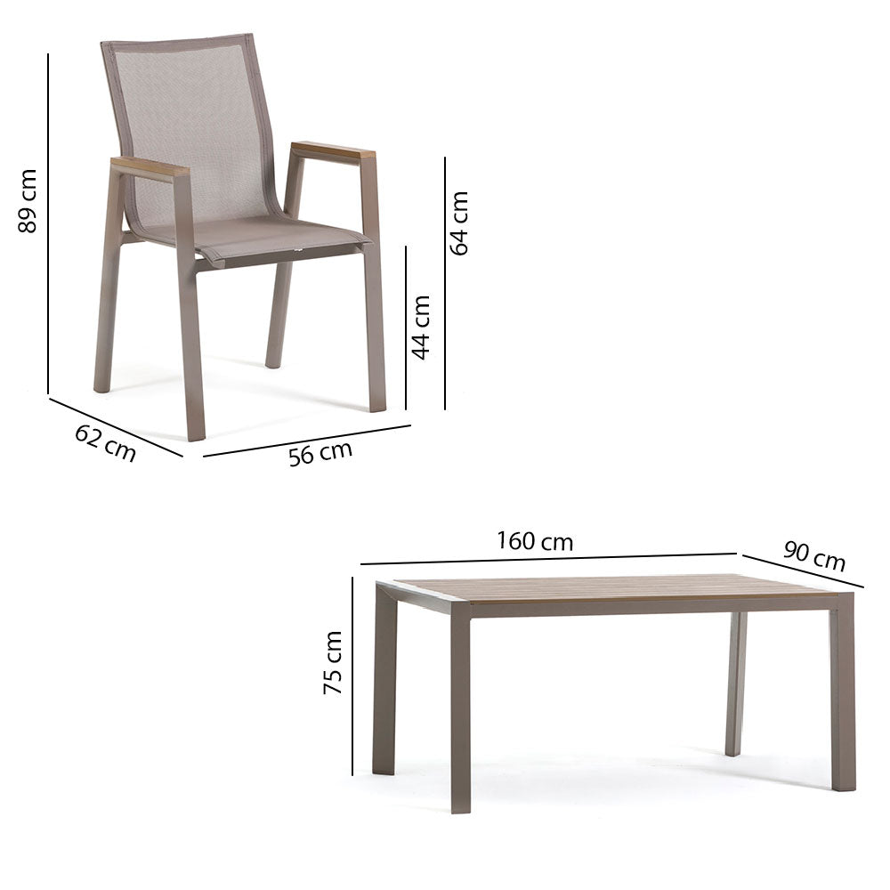 La table Liam, aux dimensions de 160x90 cm, est réalisée avec une structure robuste en aluminium peint et un plateau à lattes en polywood effet bois, qui reproduit avec réalisme les tons chauds et naturels du bois, offrant une touche accueillante et contemporaine.
