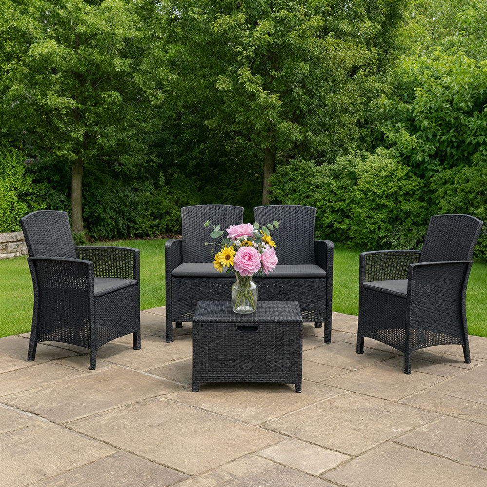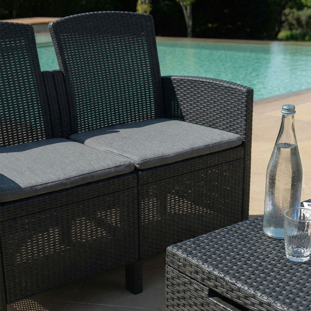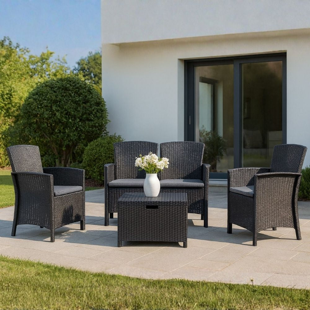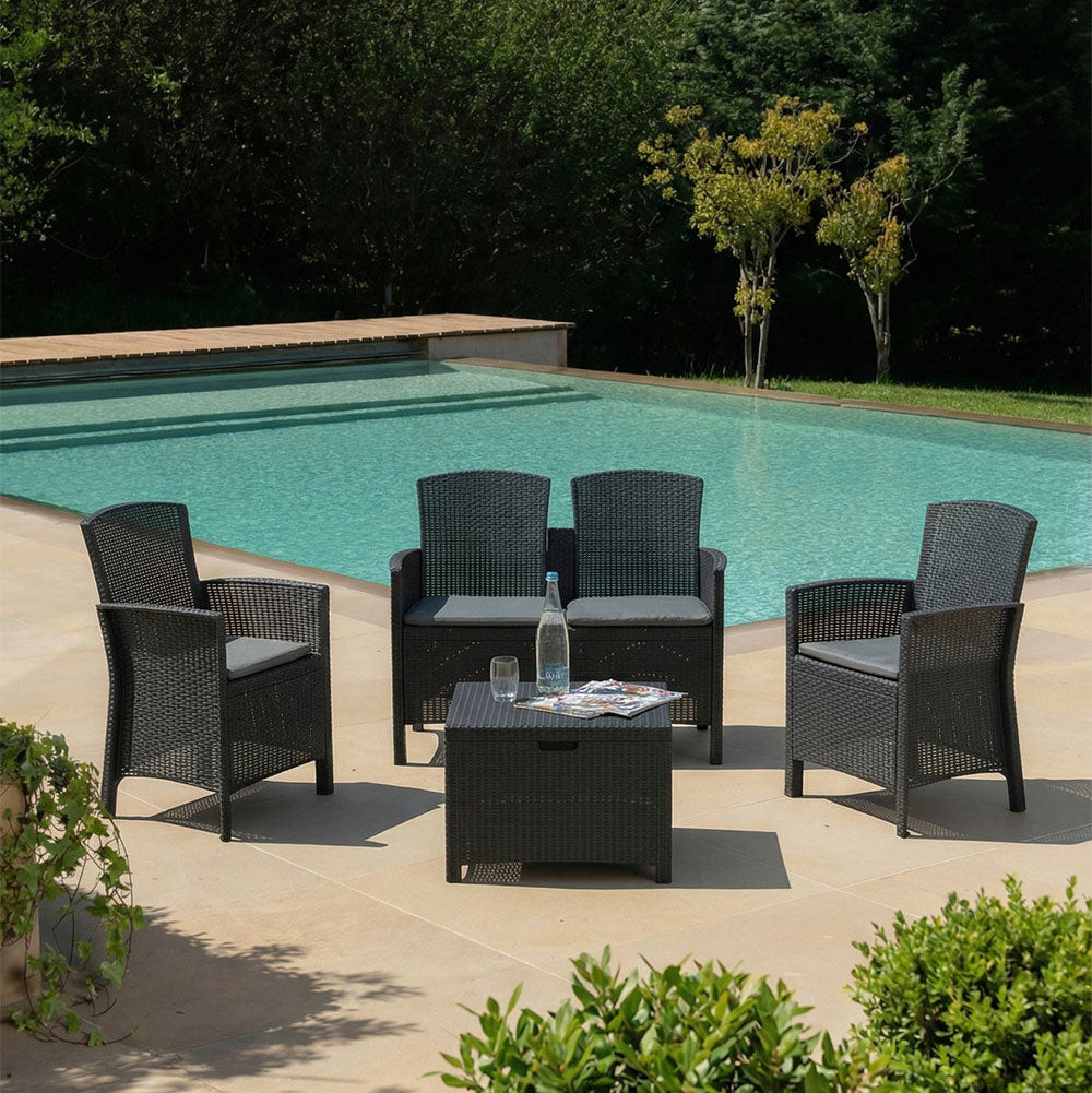 Le salon de jardin Lugano en polypropylène effet rotin est conçu pour créer un coin détente élégant et fonctionnel dans vos espaces outdoor. Le salon se compose de deux fauteuils, d’un canapé deux places et d’une table basse avec fonction coffre, idéale pour ranger coussins, plaids ou petits accessoires de jardin.