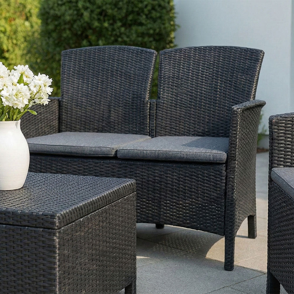 Les assises ergonomiques sont complétées par quatre coussins de siège rembourrés, qui augmentent le confort et rendent le salon particulièrement accueillant. La table basse multifonction avec rangement constitue un véritable atout pratique, parfait pour garder l’espace ordonné sans renoncer au style.