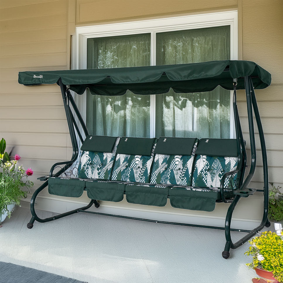 Le motif floral moderne des tissus apporte une touche de style, rendant cette balancelle unique en son genre. Les accessoires porte-objets et les ornements latéraux complètent le design, offrant à la fois praticité et élégance.